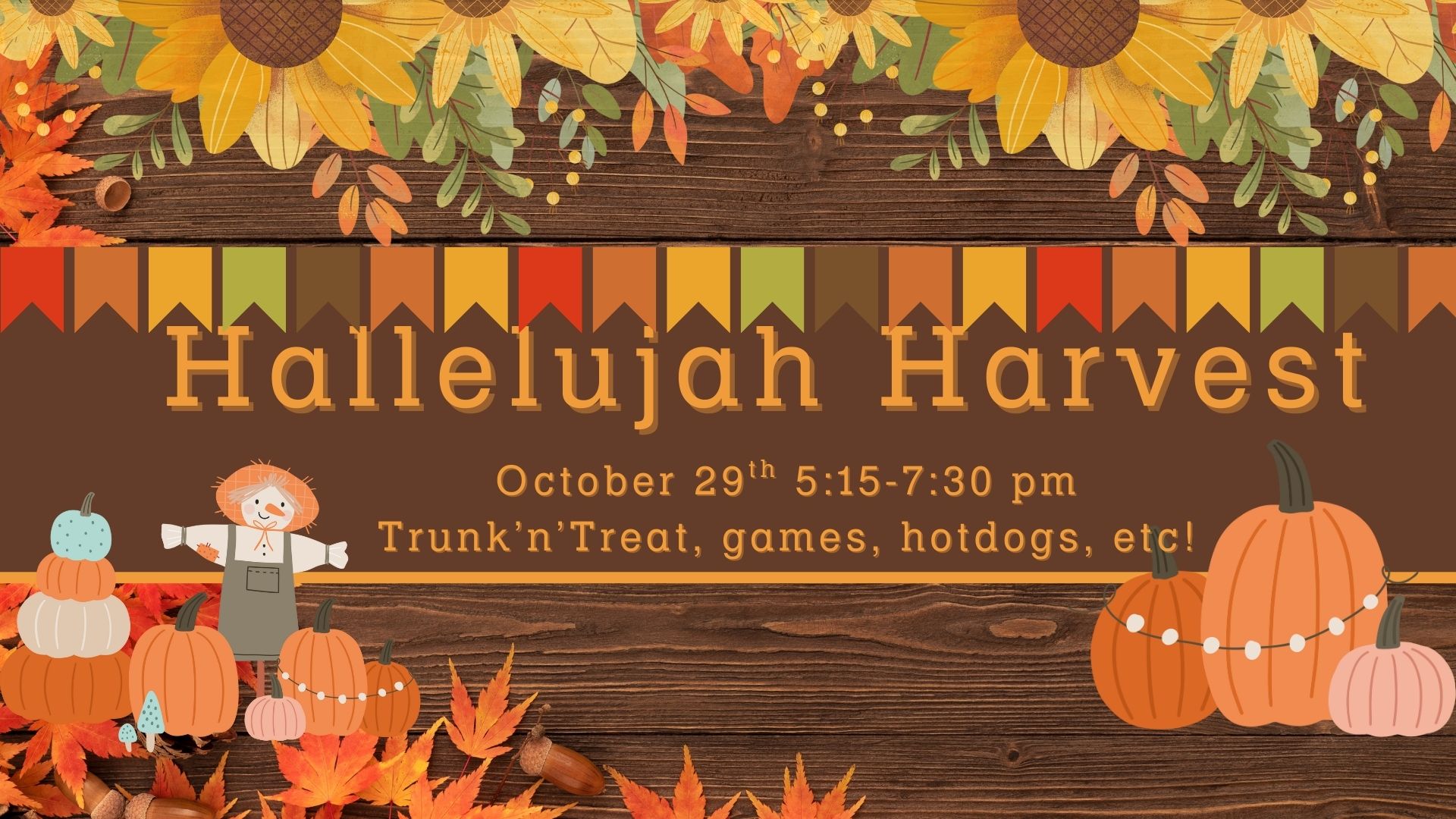 Hallelujah Harvest5:00 pm - 8:00 pmHot-Dogs, Trunk or Treat, Games, and more! 5:15-7:30 pm All ages welcome! , ...Family Event-Hot Meal5:15 pmHot Meal Served Before Children’s Church & Youth All Youth-Children-Adults &nbs , ...-
