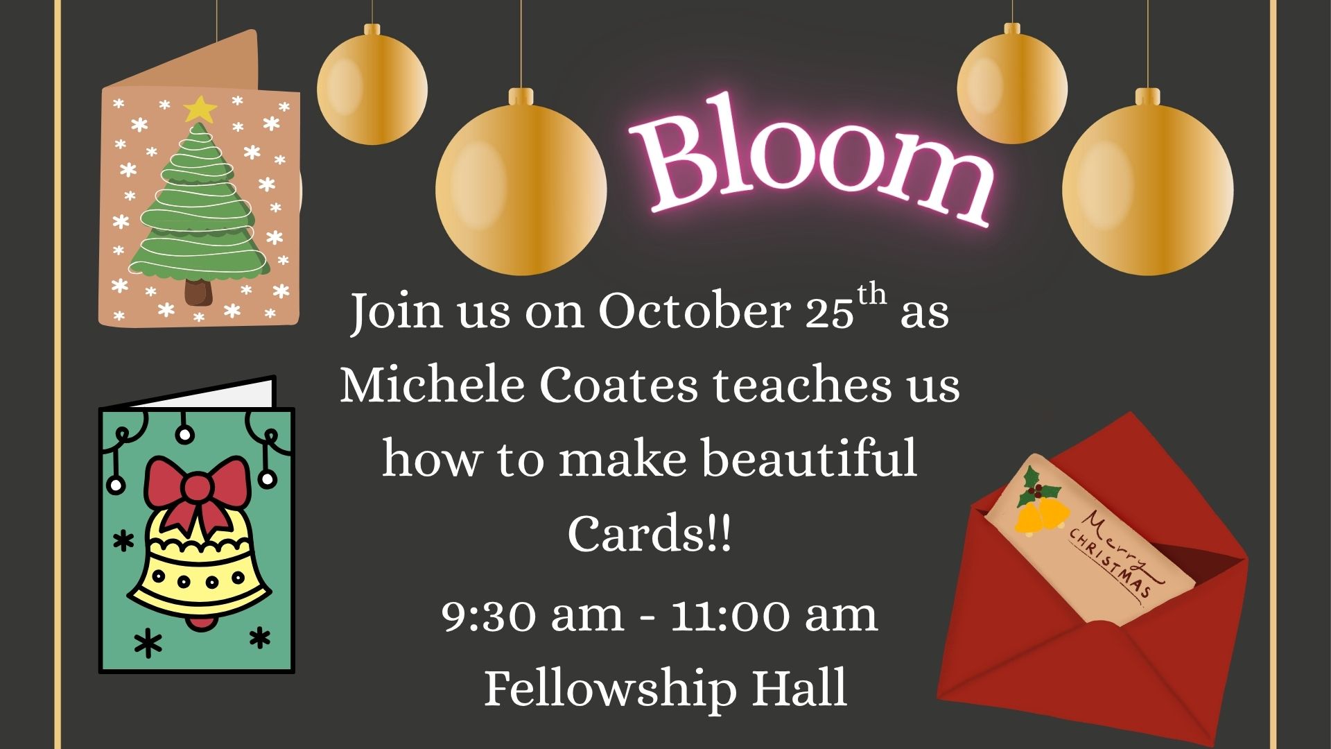 - 25Bloom9:30 am - 11:00 amThe next Women’s Bloom Event is October 25th! Michele Coates will be teaching us how to make Christmas cards! You won’t want to miss it! 9:30 am – 11:00 am , ...